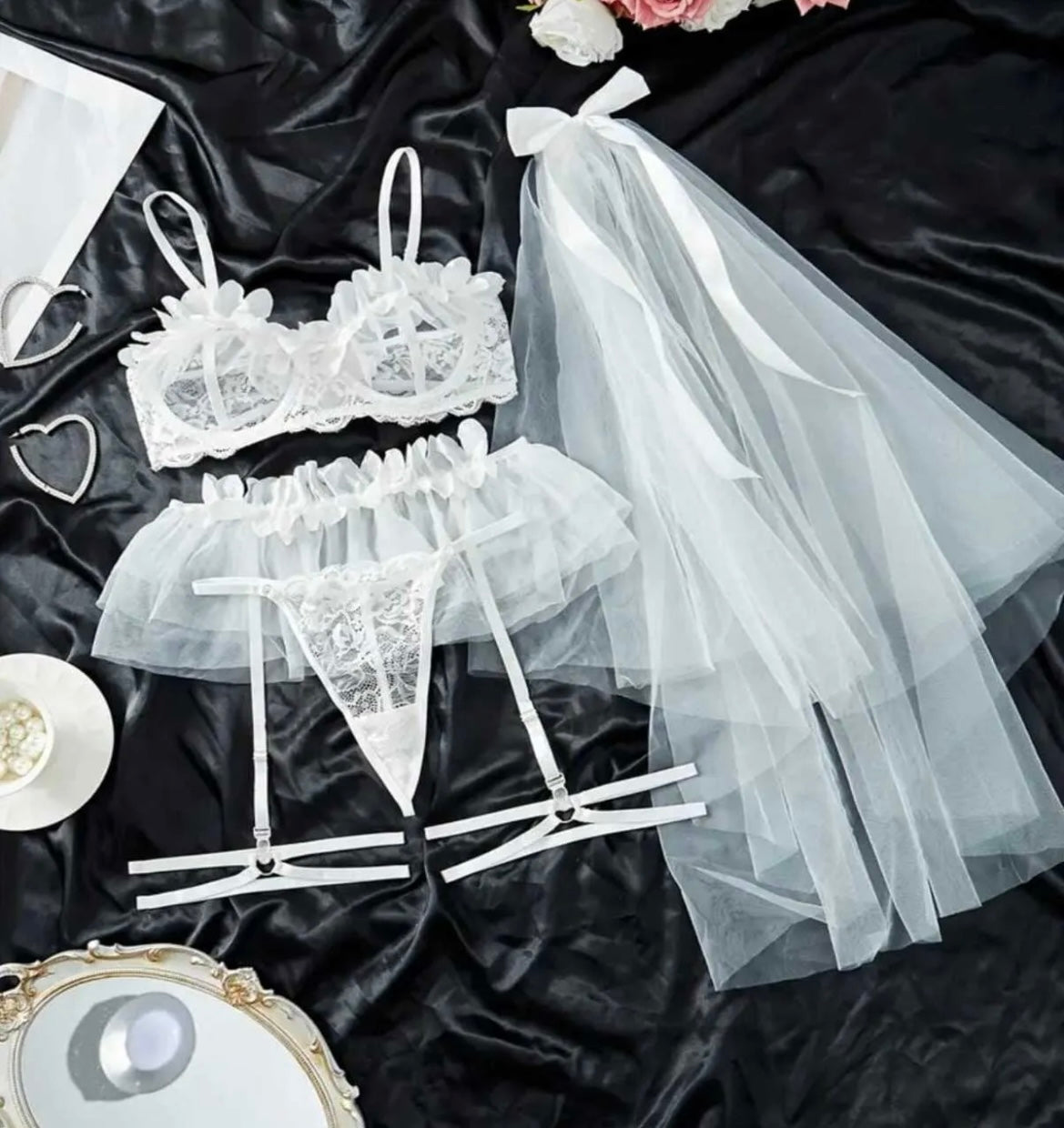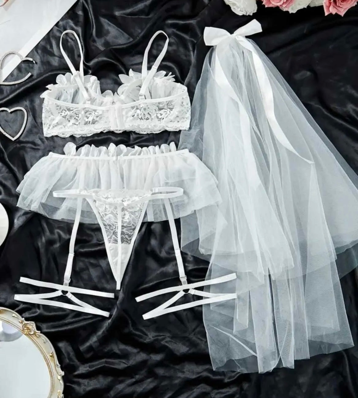4 parça: Dantel sütyen, fırfırlı jartiyer kemer, dantel tanga ve uzun tüllü duvak