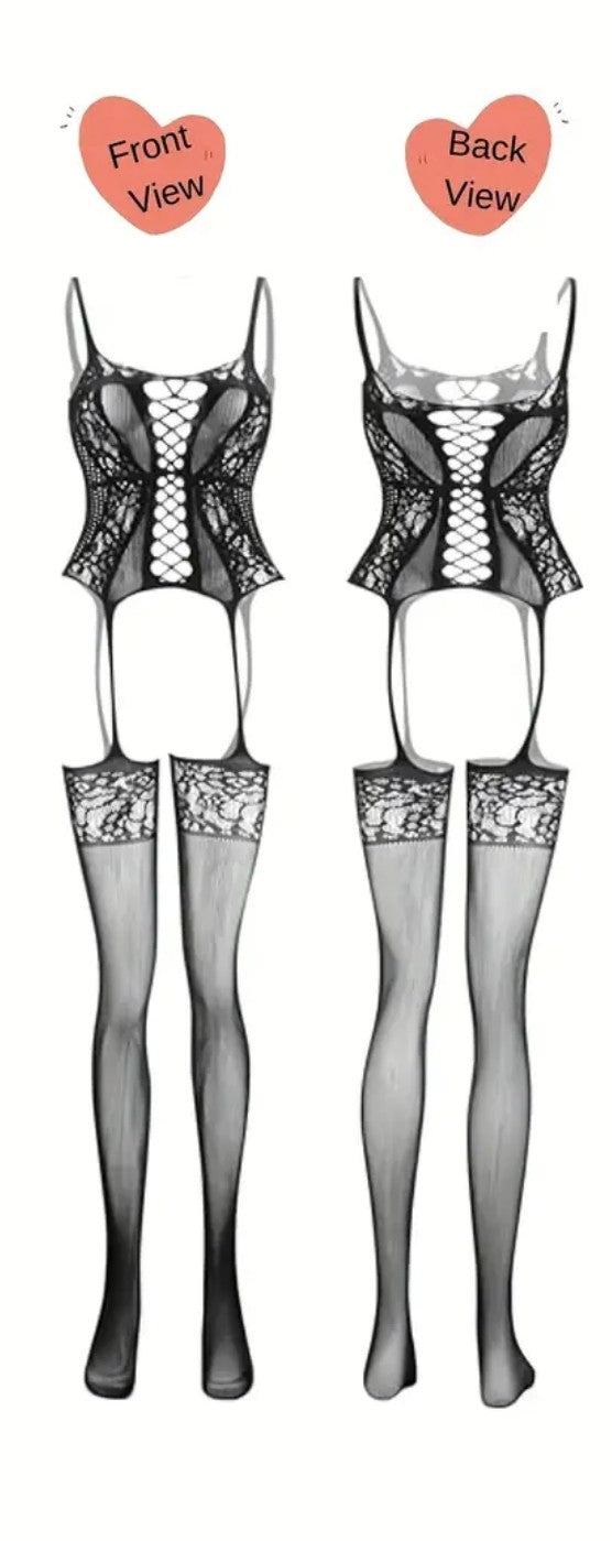 Kurdele Detaylı Dantel Vücut Çorabı – Jartiyer Çoraplı Bodystocking