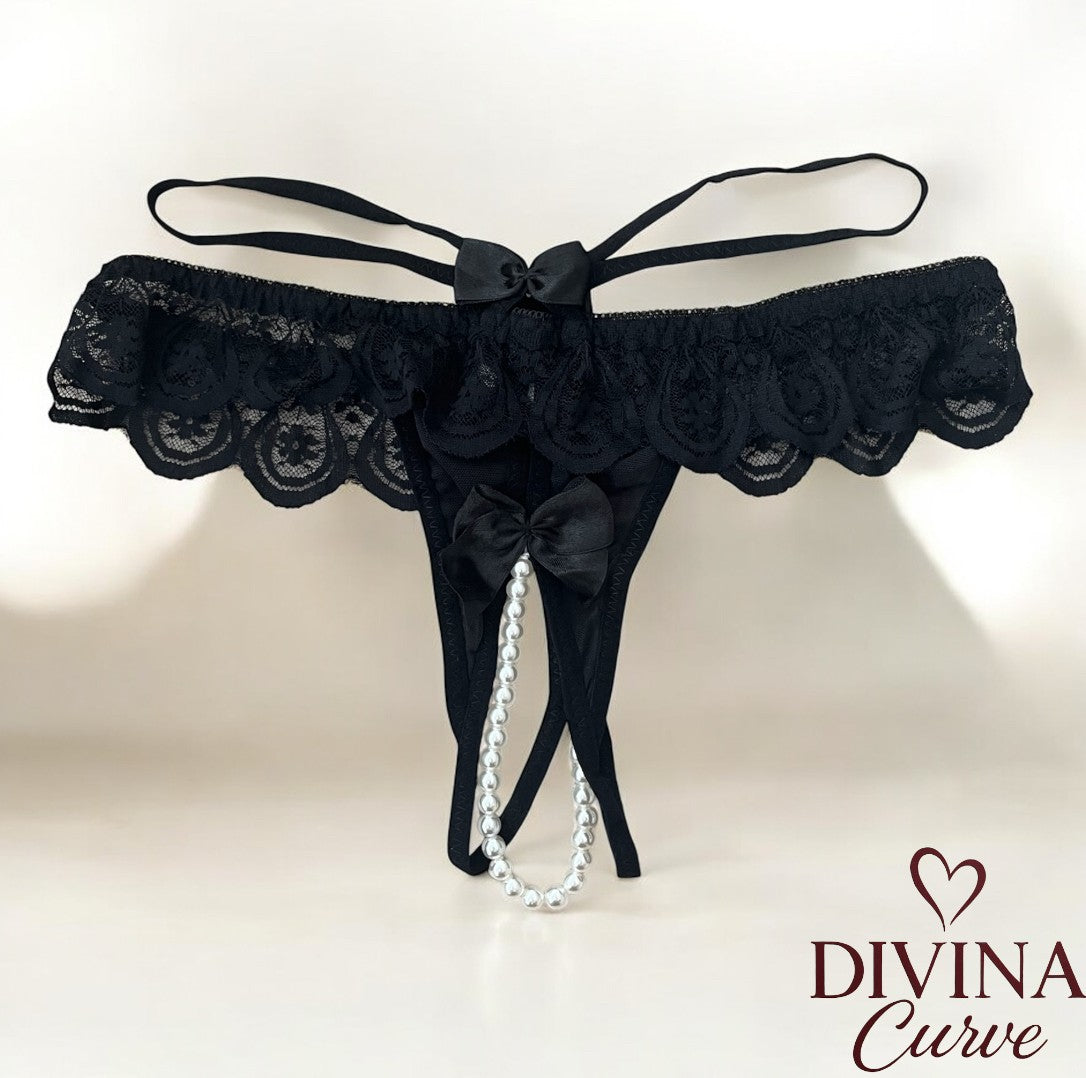 Noir Pearl, zariflik ve tutkunun buluştuğu bir tasarımdır. İnce dantel kemer, ortadaki inci detayları ve minik fiyonklarla taçlandırılan bu fantazi string külot, özel anlara cesur bir dokunuş katmak isteyenler için ideal. Yandan bağlamalı yapısıyla vücuda uyum sağlar.