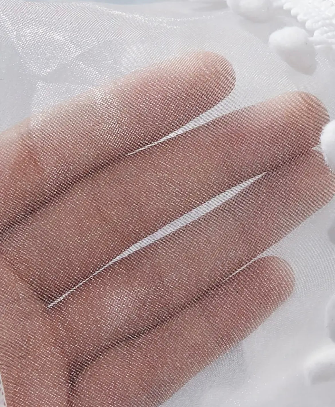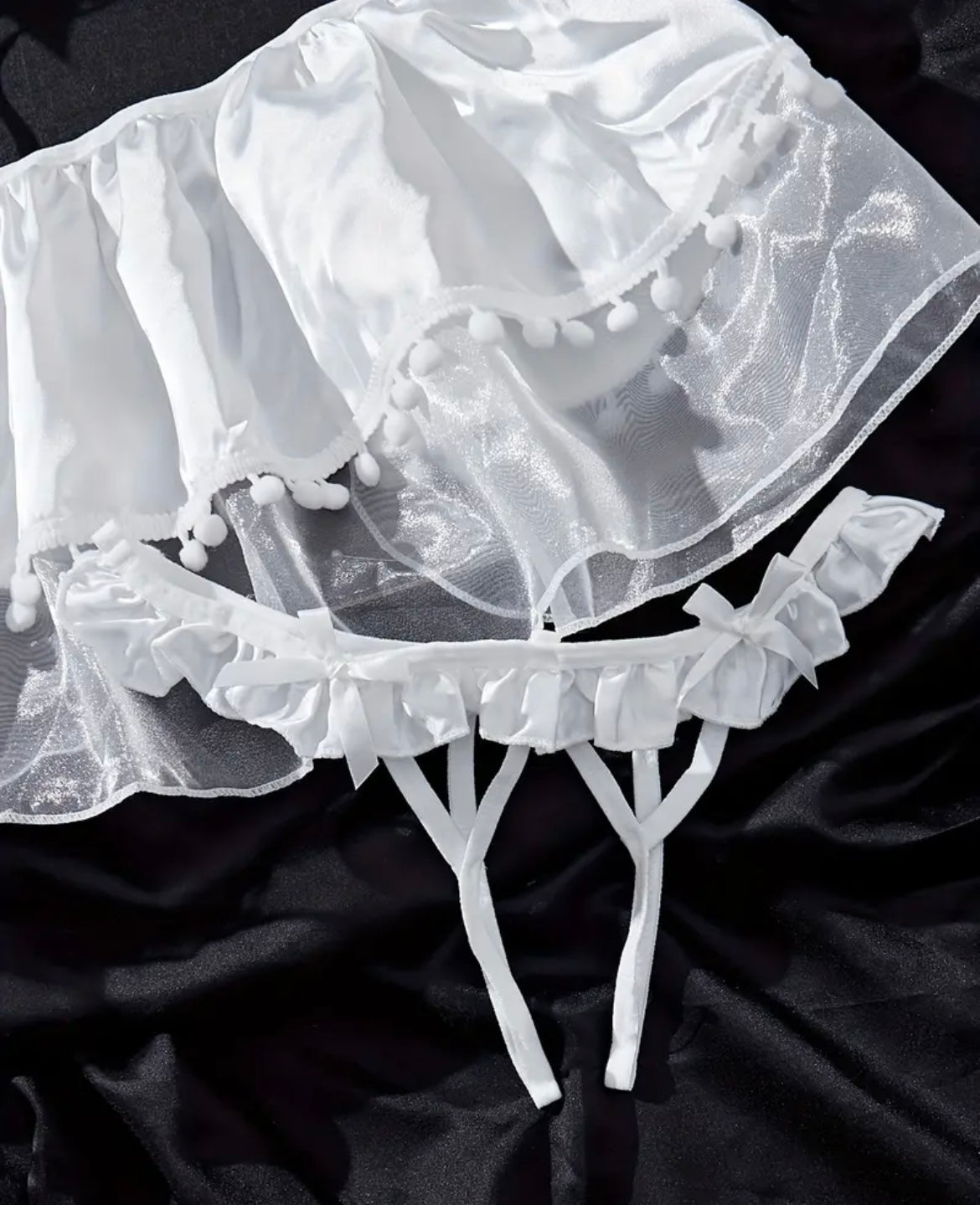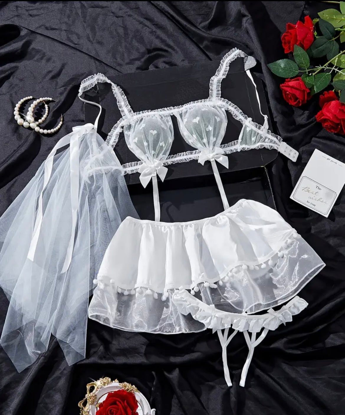 4 parçadan oluşur: Tül sütyen, mini etek/jartiyer ve duvak