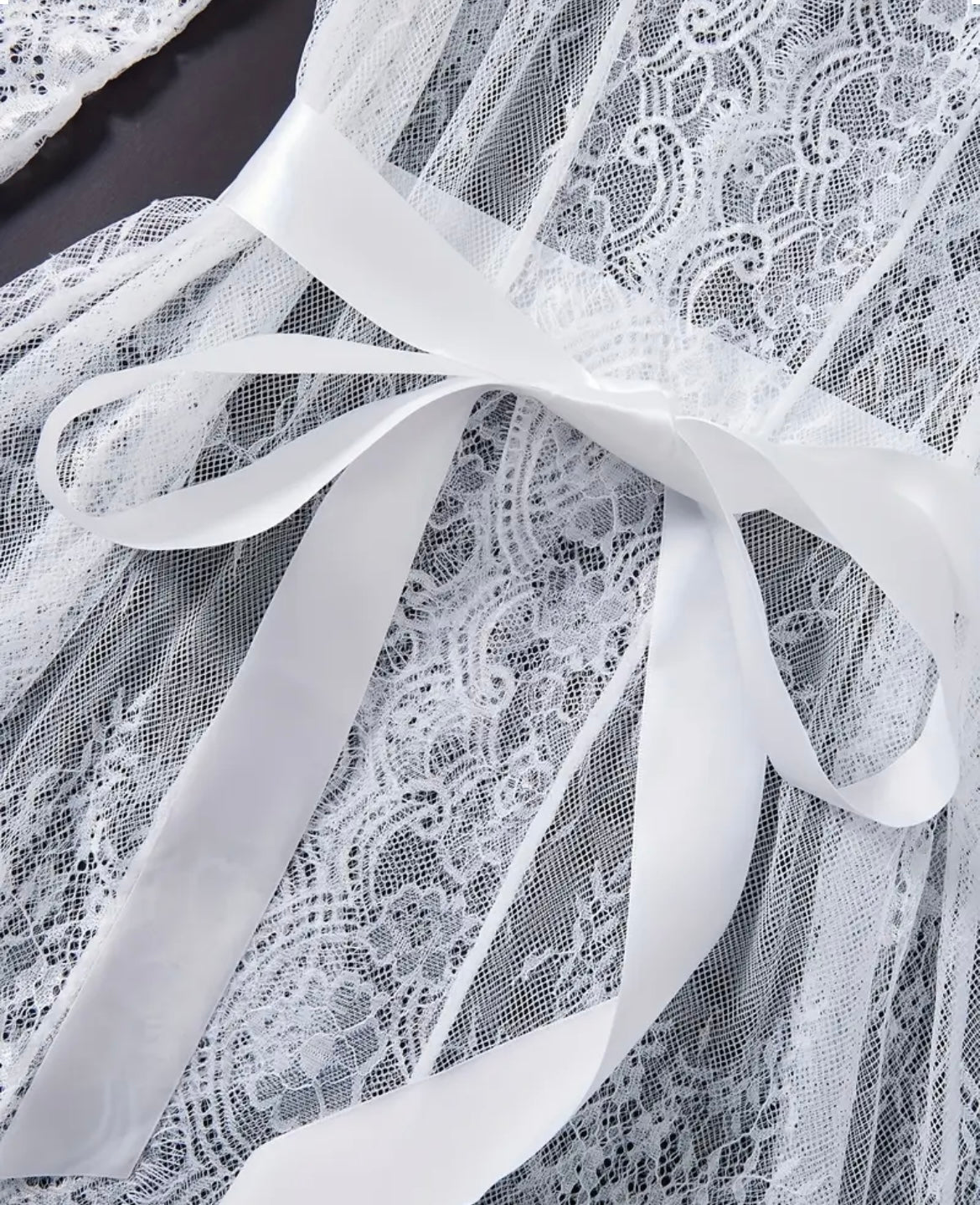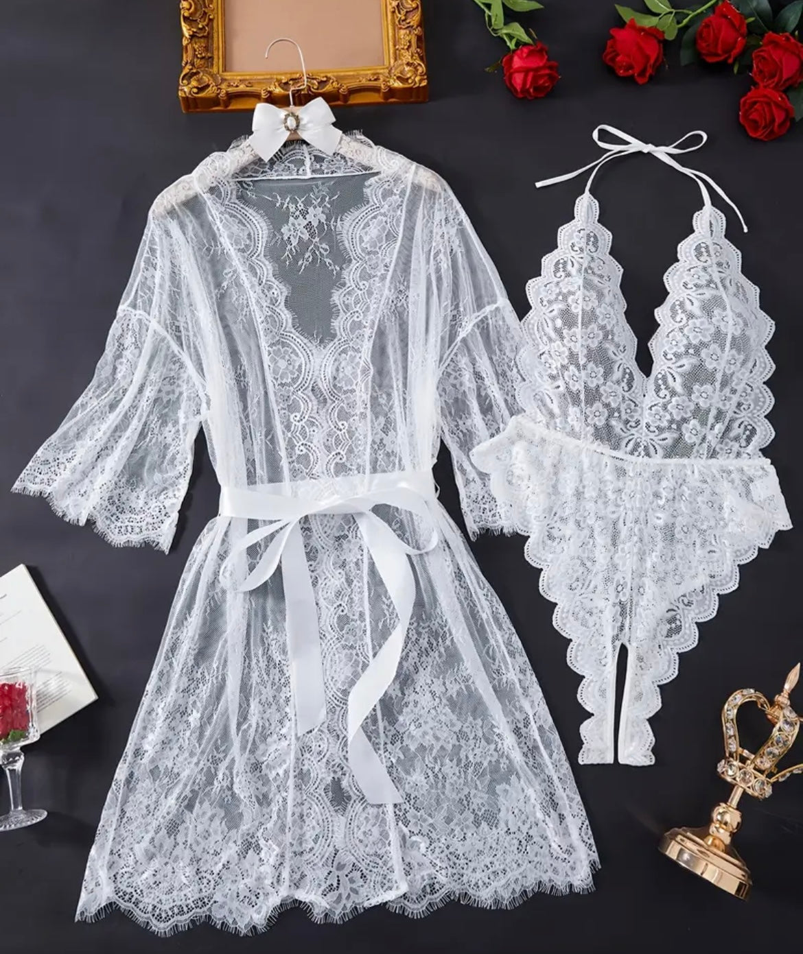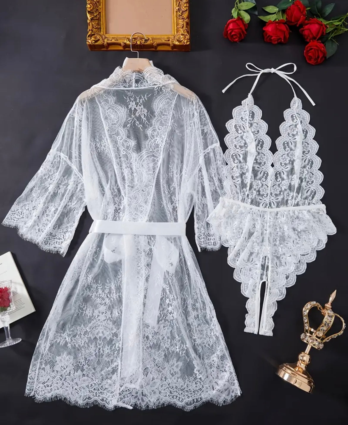 White Bridal Bliss | Büyük Beden Dantel Sabahlık & Body Suit Gelin Takımı