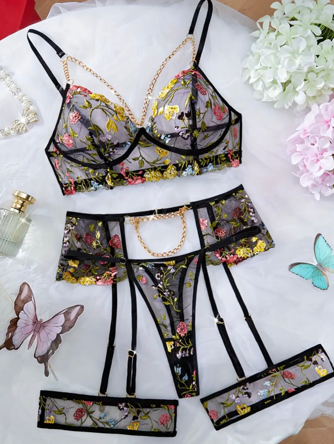 Wild Bloom | Çiçek İşlemeli Dantel 4 Parça Lingerie Seti – Altın Zincir Detaylı